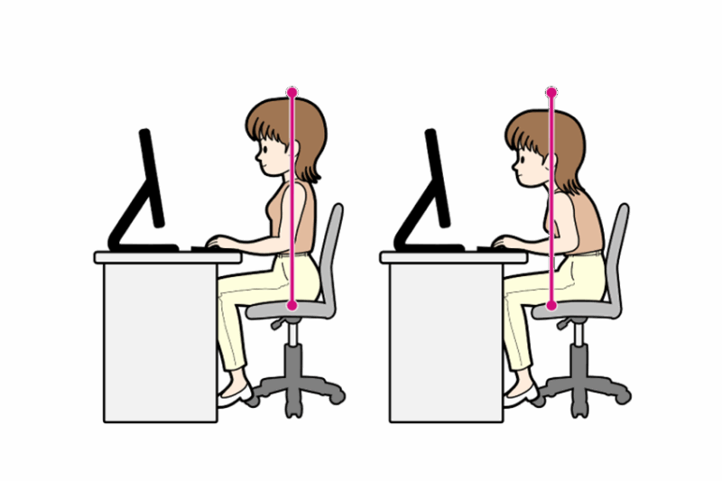 - モニターの位置: 画面は目線の高さに調整し、頭が前に出ないようにしましょう。ノートパソコンとデスクトップパソコンでは頚椎の角度に大きな違いがあります。ノートパソコンの場合は、スタンドやモニター台を活用するのが効果的です。