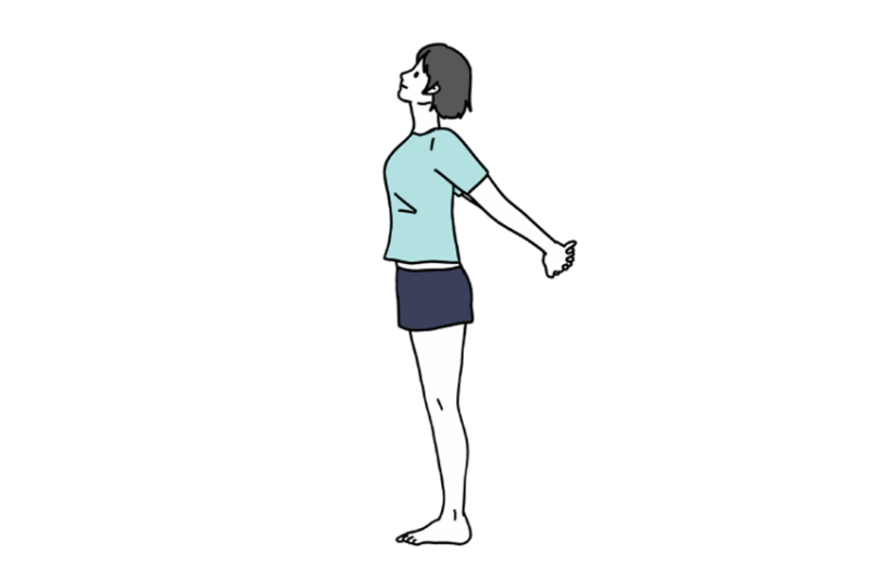 - 足を肩幅に開いて立ち、両手を背中でお尻のあたりで組みます。