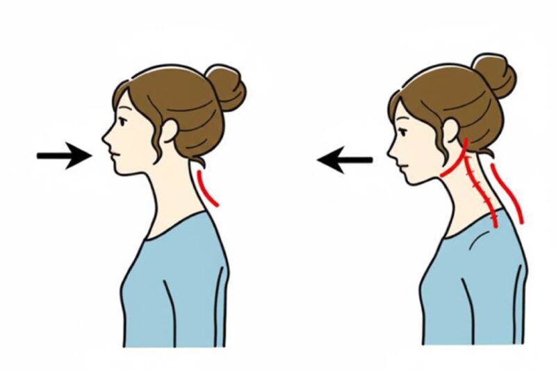 背筋を伸ばして座り、あごを軽く引いて頭を後方にスライドさせます。このとき、首の後ろが伸びる感覚を意識しましょう。5秒キープを10回繰り返すと、首の正しい位置を取り戻すのに役立ちます。