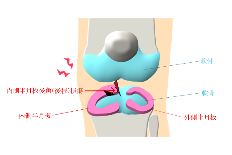 半月板損傷は、若年者ではサッカーやバスケットボールなど膝を回旋させるスポーツ外傷が原因となりますが、中高年者に関しては、立ち上がり時や無理な態勢で膝を捻った際の軽微な外傷で受傷するケースや、全くケガのきっかけが無くても疼痛が感じられ始めた、といったケースが多いのです。また時には「バチッ」と音が鳴ったと同時に膝裏から外側にかけて痛みが走った、という場合も多くあり、これはのちに説明する “半月板後角(後根)損傷” を生じている場合が多く、早期に変形性膝関節症に進行したり、大腿骨内顆骨壊死になってしまう場合が多く注意が必要です。これらの損傷の原因としては、40歳を超えると半月板に含まれる水分量が減少し、クッションとしての性能が落ち、わずかな衝撃でも損傷を受けやすくなるためです。この状態を “半月板の変性変化” といいます。