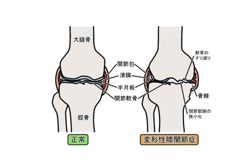 変形性膝関節症は、加齢や肥満などが原因となり、膝関節の軟骨が弾力性を失って摩耗し、関節炎や変形が生じる疾患です。